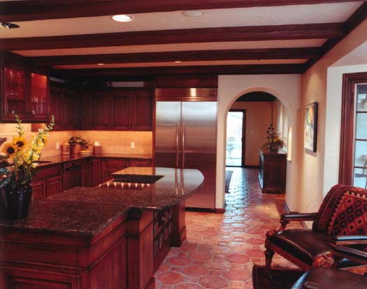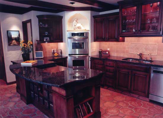In remodeling of this kitchen we took advantage of the existing Saltillo tile floors and played up the Spanish characteristics of this residence. Not a sunlit space, we used dramatic lighting and warm colors and texture to create a cozy entertaining environment.
